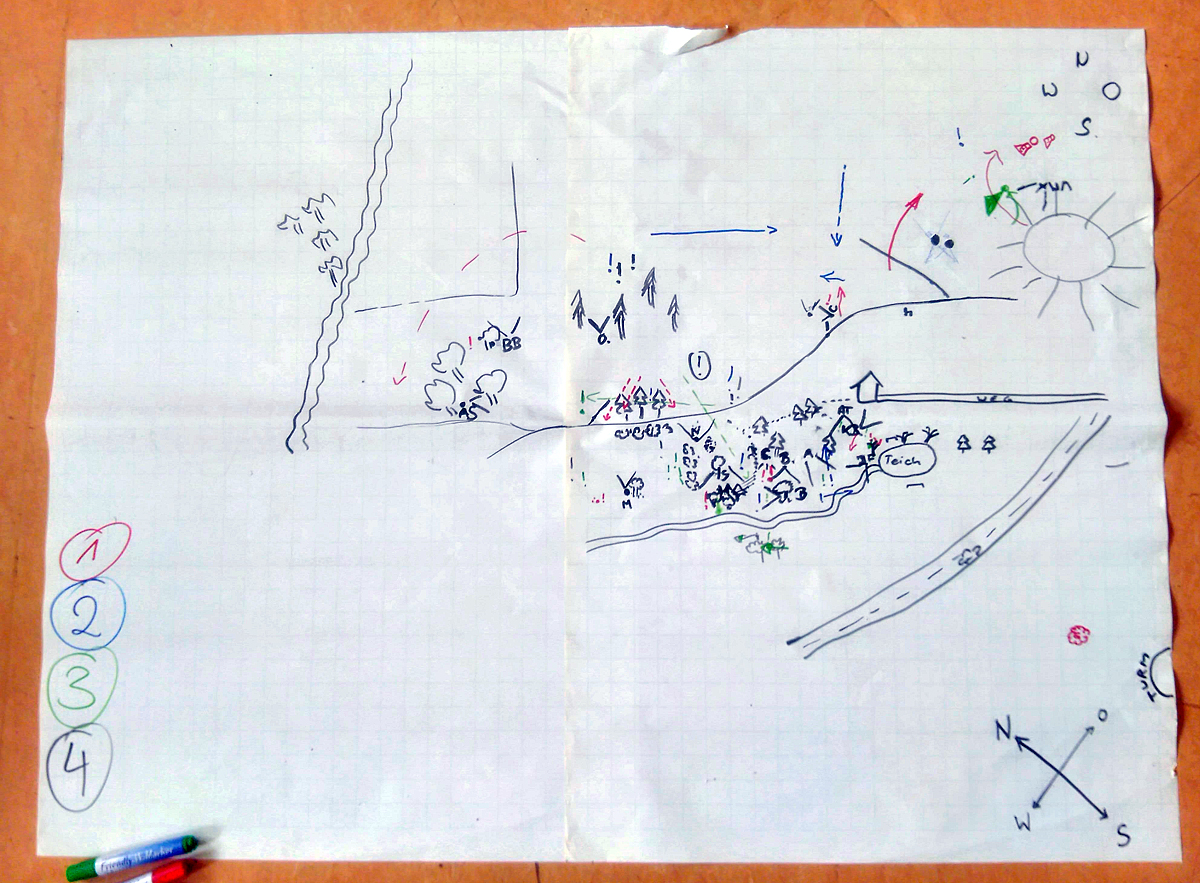 Handkarte der Vogelstimmen und Bewegungen im Wald