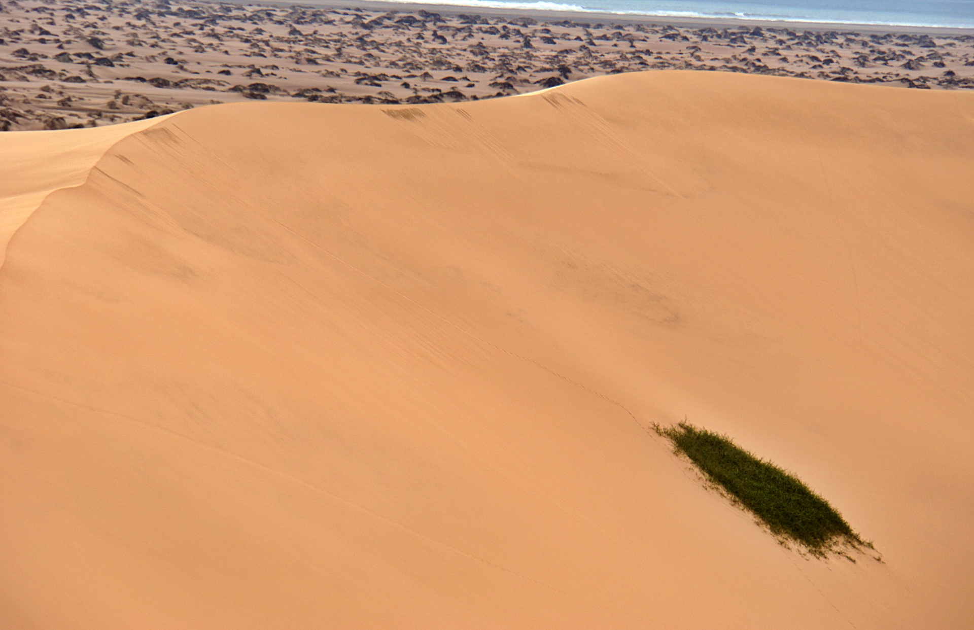 Pflanzen-Puschel mitten im Dünensand – das Gestrüpp der !Nara sammelt Sand und bildet damit hohe Dünen, wobei der größte Teil der Pflanze im Sand versteckt ist.
