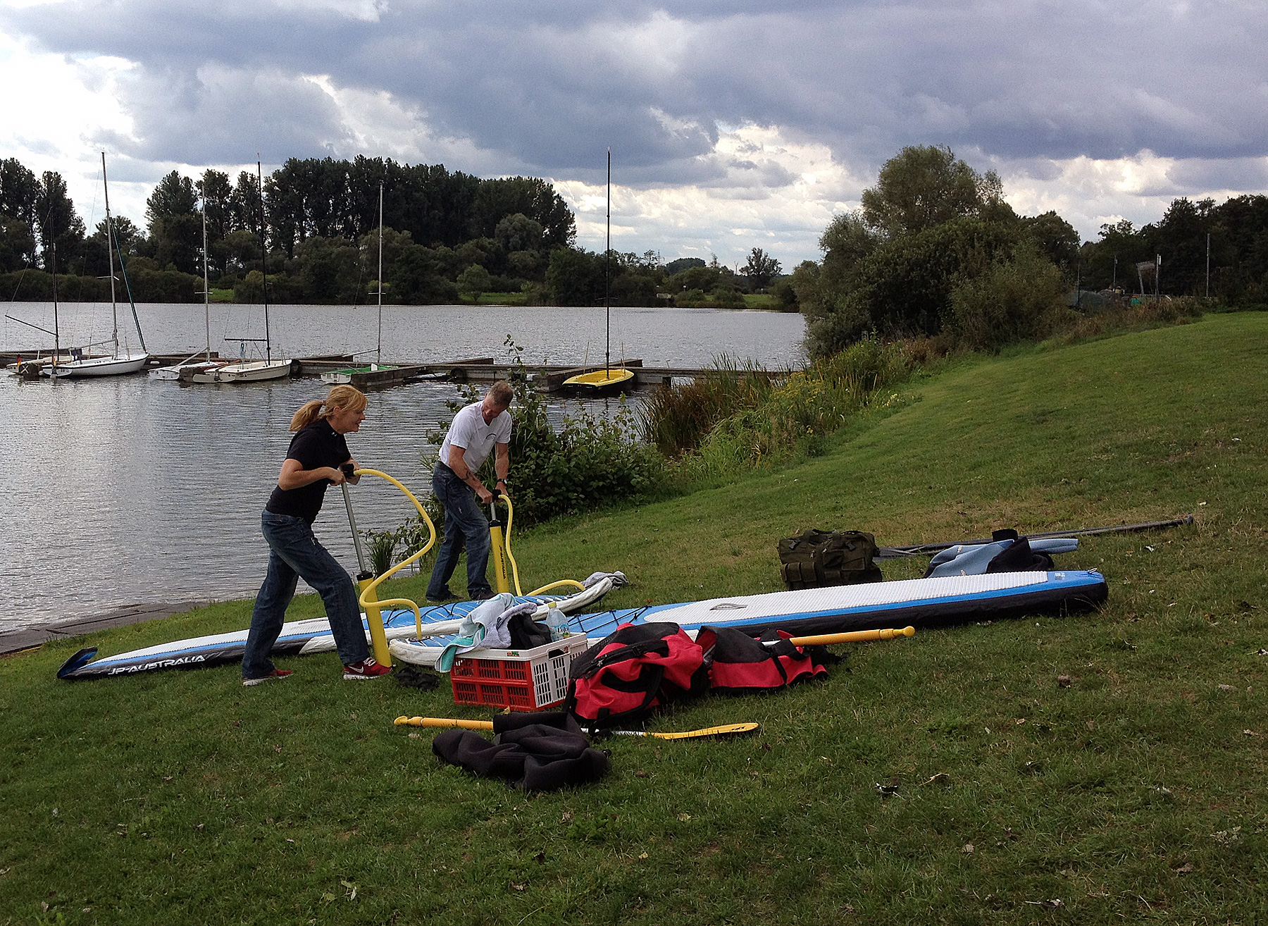 supkinzigsee01 ← Zurück Weiter → Vor dem Vergnügen die Arbeit: die SUP-Paddleboards von Hand aufpumpen.
